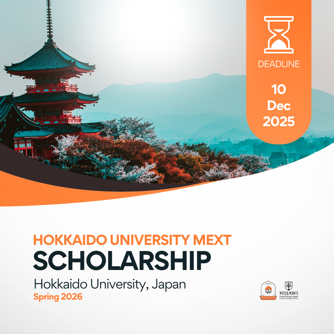 وحدة التأهيل الوظيفي في كلية الحجاوي للهندسة التكنولوجية تعلن عن توفر منحة MEXT 2026 المقدمة من جامعة هوكايدو، وهي فرصة ممولة بالكامل للطلبة الدوليين للدراسة في بيئة أكاديمية مرموقة في اليابان. تقدم هذه المنحة من قبل وزارة التعليم اليابانية (MEXT)، وتشمل جميع النفقات الأساسية مثل الرسوم الدراسية، والمخصصات الشهرية، وتذاكر السفر ذهابًا وإيابًا. جامعة هوكايدو، المعروفة بأبحاثها المتقدمة ورؤيتها العالمية، ترحب بالطلبة من خلفيات أكاديمية متنوعة لمتابعة دراسة البكالوريوس أو الماجستير أو الدكتوراه في مجموعة واسعة من التخصصات.