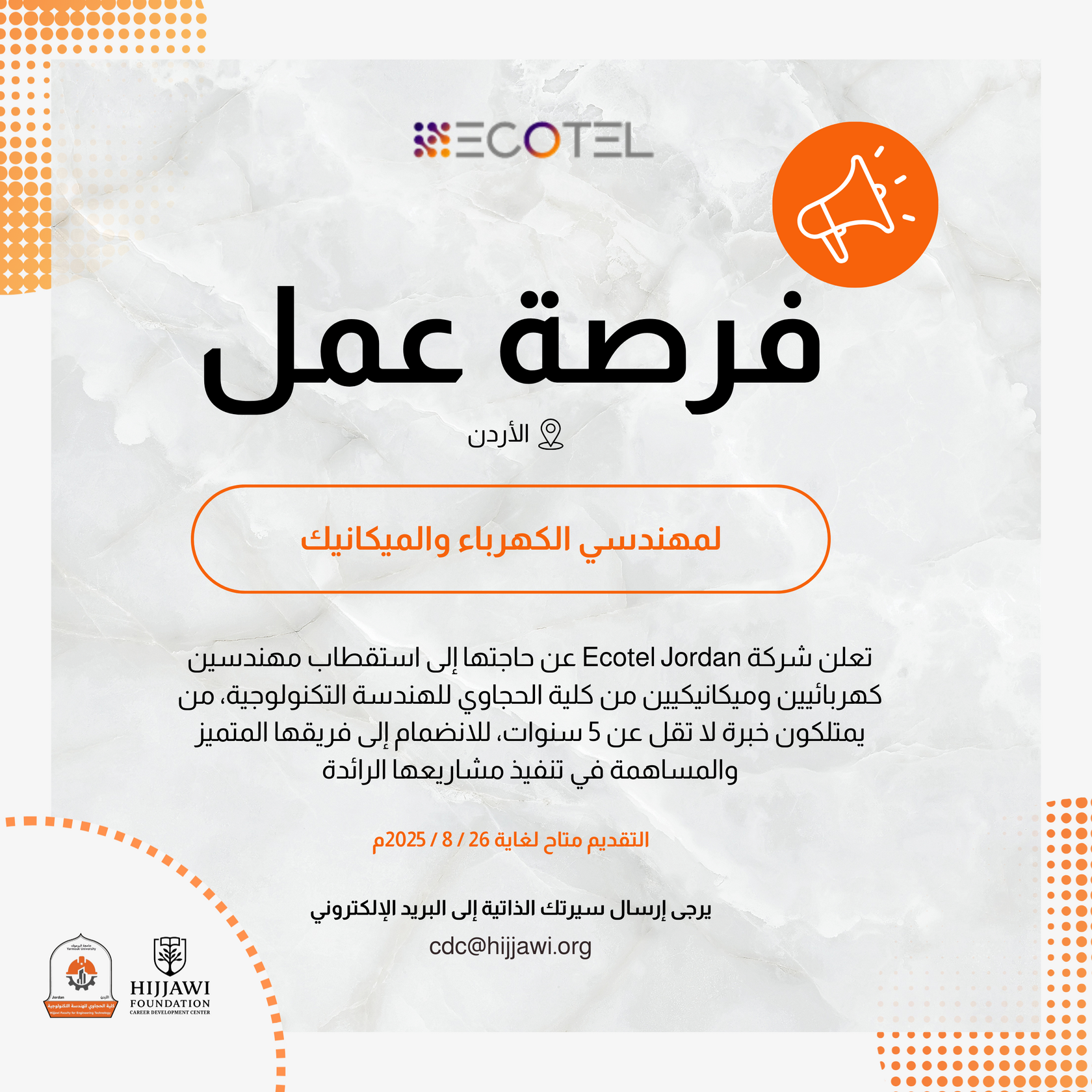 إذا كنت شغوفًا بالتميز الهندسي ومستعدًا للانضمام إلى فريق مُبتكر، يُرجى إرسال سيرتك الذاتية إلى cdc@hijjawi.org. يُرجى ذكر المسمى الوظيفي (مهندس كهربائي/ميكانيكي - EcoTel الأردن) في خانة الموضوع. آخر موعد للتقديم هو ٢٦ أغسطس ٢٠٢٥.